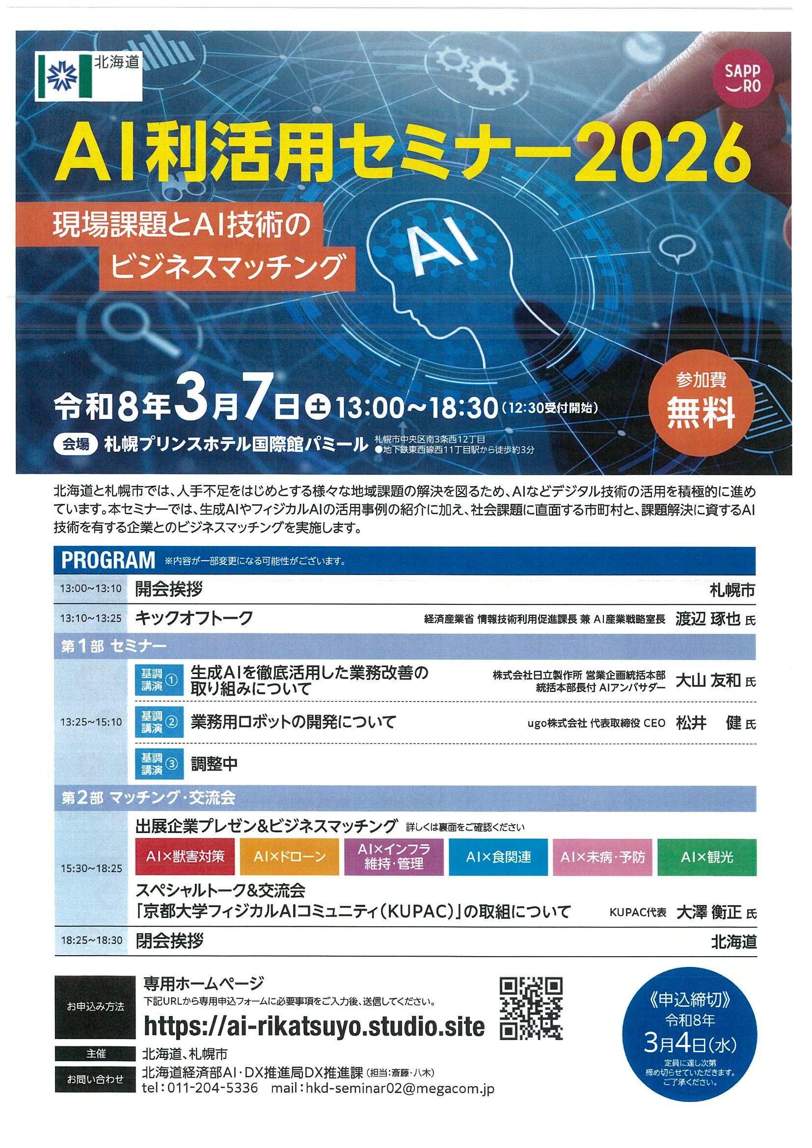 北海道と札幌市では、人手不足をはじめとする様々な地域課題の解決を図るため、AIなどデジタル技術の活用を積極的に進めています。 今般、昨年11月に続いて『AI利活用セミナー2026』を開催することとなりました。 本セミナーでは、生成AIやフィジカルAIの活用事例の紹介に加え、社会課題に直面する市町村と、課題解決に資するAI技術を有する企業とのビジネスマッチングを実施します。