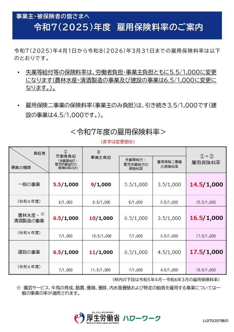 > 令和7年(2025)年度 雇用保険料率のご案内